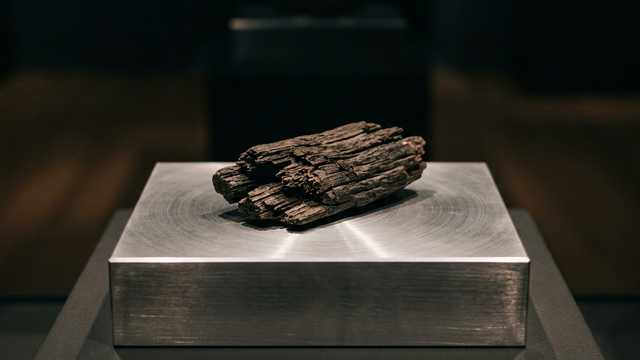 一際目を引くのは、アルミを溶解するために激しい熱に晒され続けてきた産業用の巨大な坩堝(るつぼ)である。その表面には、自然釉が偶然の産物として付着し、独特の景色を生み出している。また、香職人が長年にわたって使い込み、幾度も塗り返された柿渋で黒光りする三枚の板材。さらには、鎌倉時代に写経した経典を納めて土中に埋められたという常滑焼の「経塚壺」には、底が抜けた隙間から、途方もない時を漂流してきた流木が突き出し、絡み合っている。